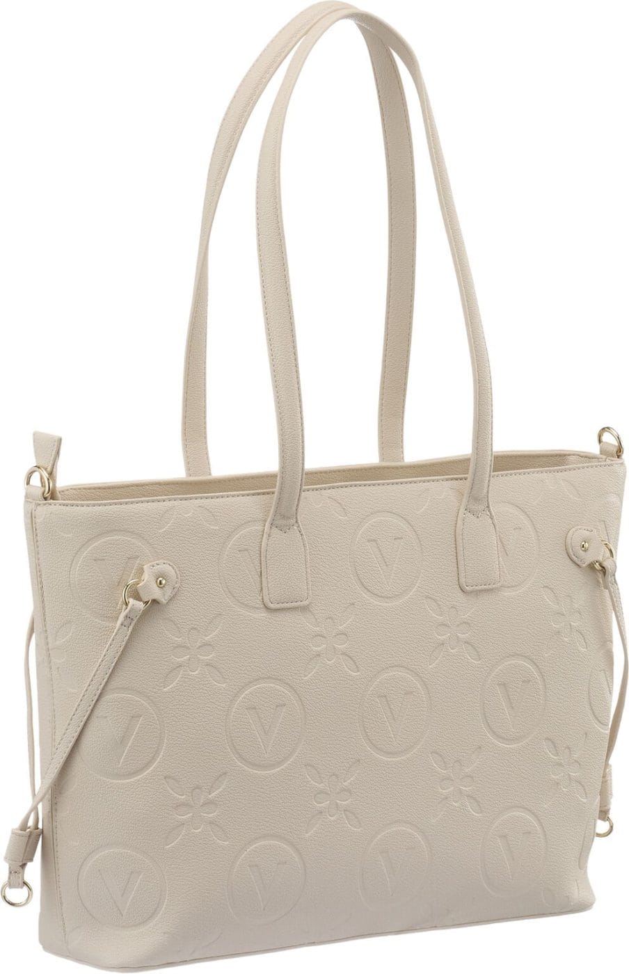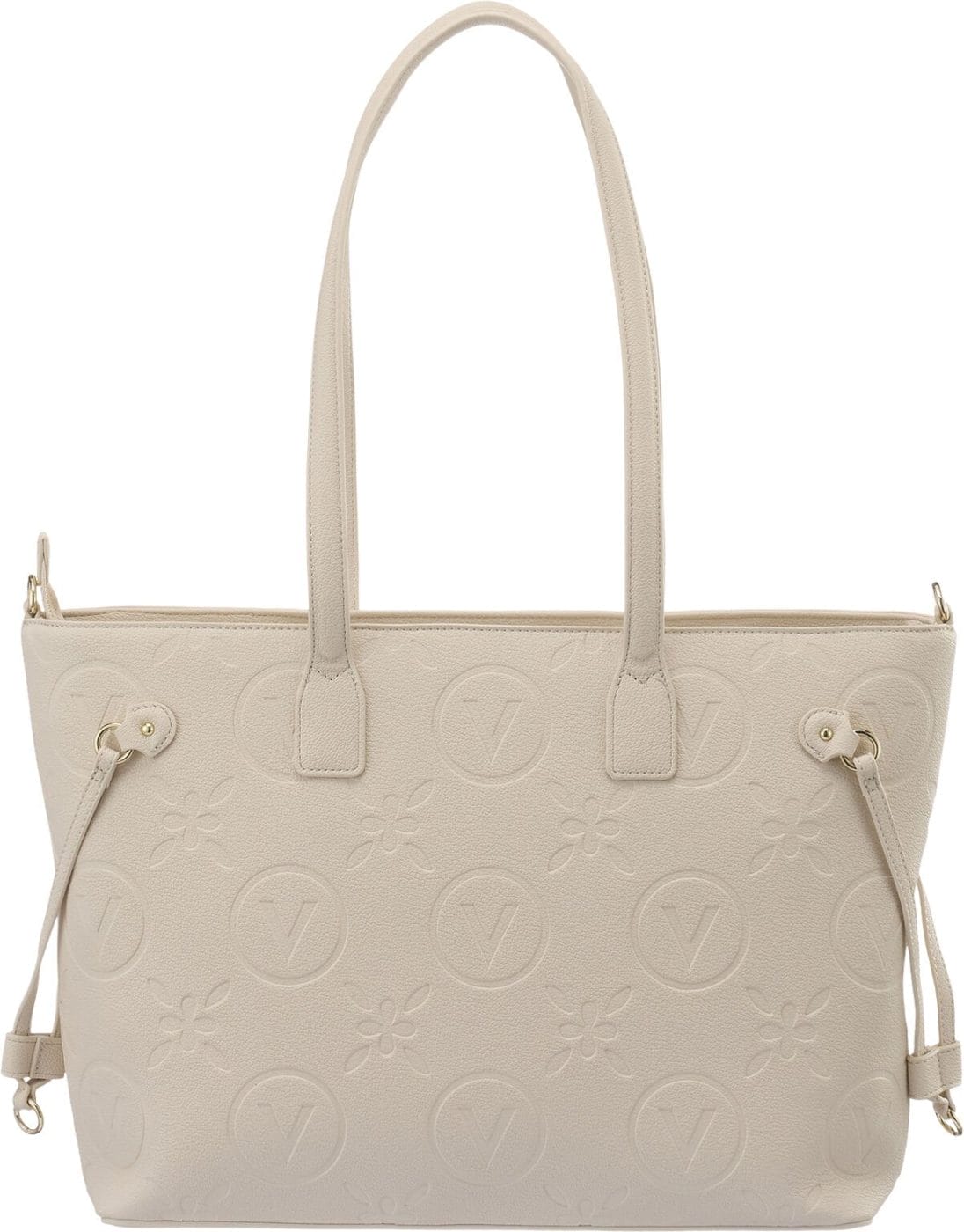 Valentino Samba RE shopper tasken er lavet af PU og har et præget design med V-logo i cirkulære emblemer, vekslende med blomsterdetaljer, hvilket giver et raffineret og elegant look. De lange håndtag giver komfort ved bæring, og den justerbare lange rem giver mulighed for at bære tasken som crossbody. Valget mellem to forskellige stropper giver alsidige stylingmuligheder, uanset om du foretrækker et minimalistisk eller sporty look. Lynlåsen afslører et rummeligt indre, der har plads til alle dine nødvendigheder.