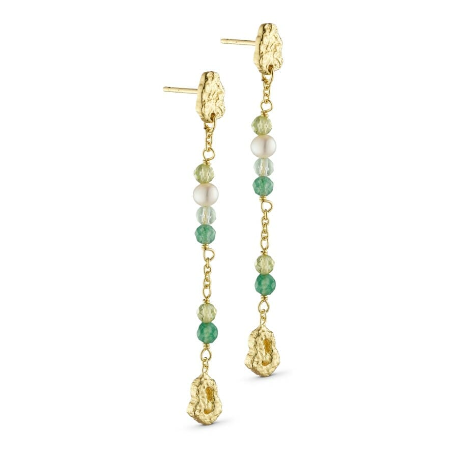Pure By Nat Hængeørering Med Grøn Sten og Perler Guldbelagt
