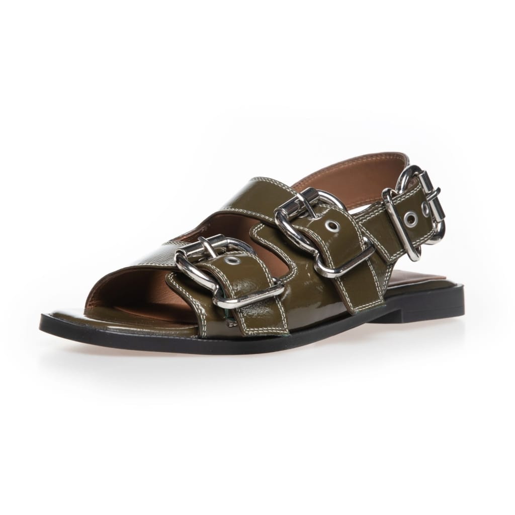 Flotte sandaler med store spænder i sølvmetal og flot lak skind kvalitet med crickle effekt. Cool detalje med tydelige stikninger langs kanterne.