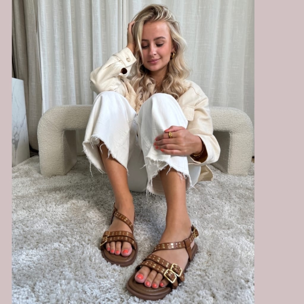 Sandaler med remme i læder med guld nitter. Sandalerne lukkes med lille spænde på ankelremme. Indersål i skind med vores specielle bløde Copenhagenshoes latex skum