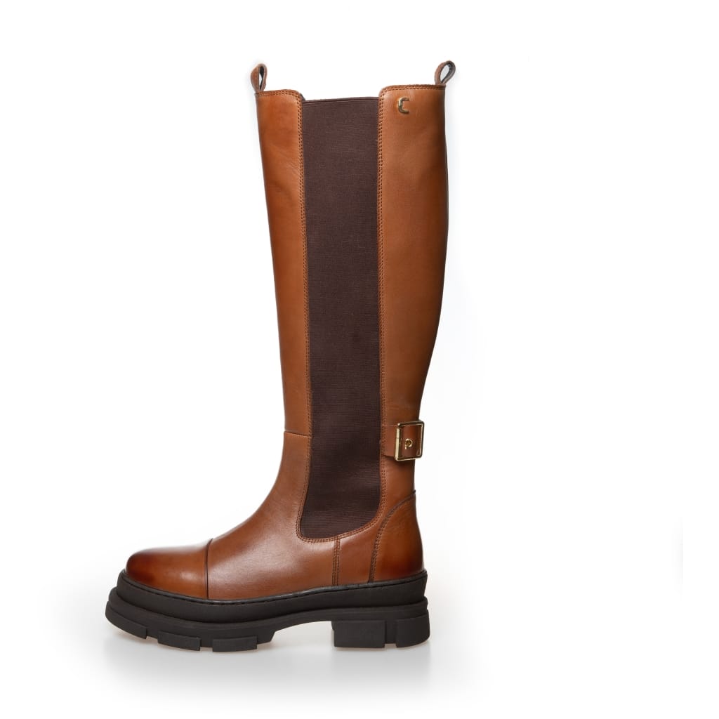 Lang støvle i cognac farvet læder med dekorativ guld spænde detalje på bagsiden. Støvlen har chunky såler og let for indeni. Støvlen har elastik på begge sider for optimal pasform.