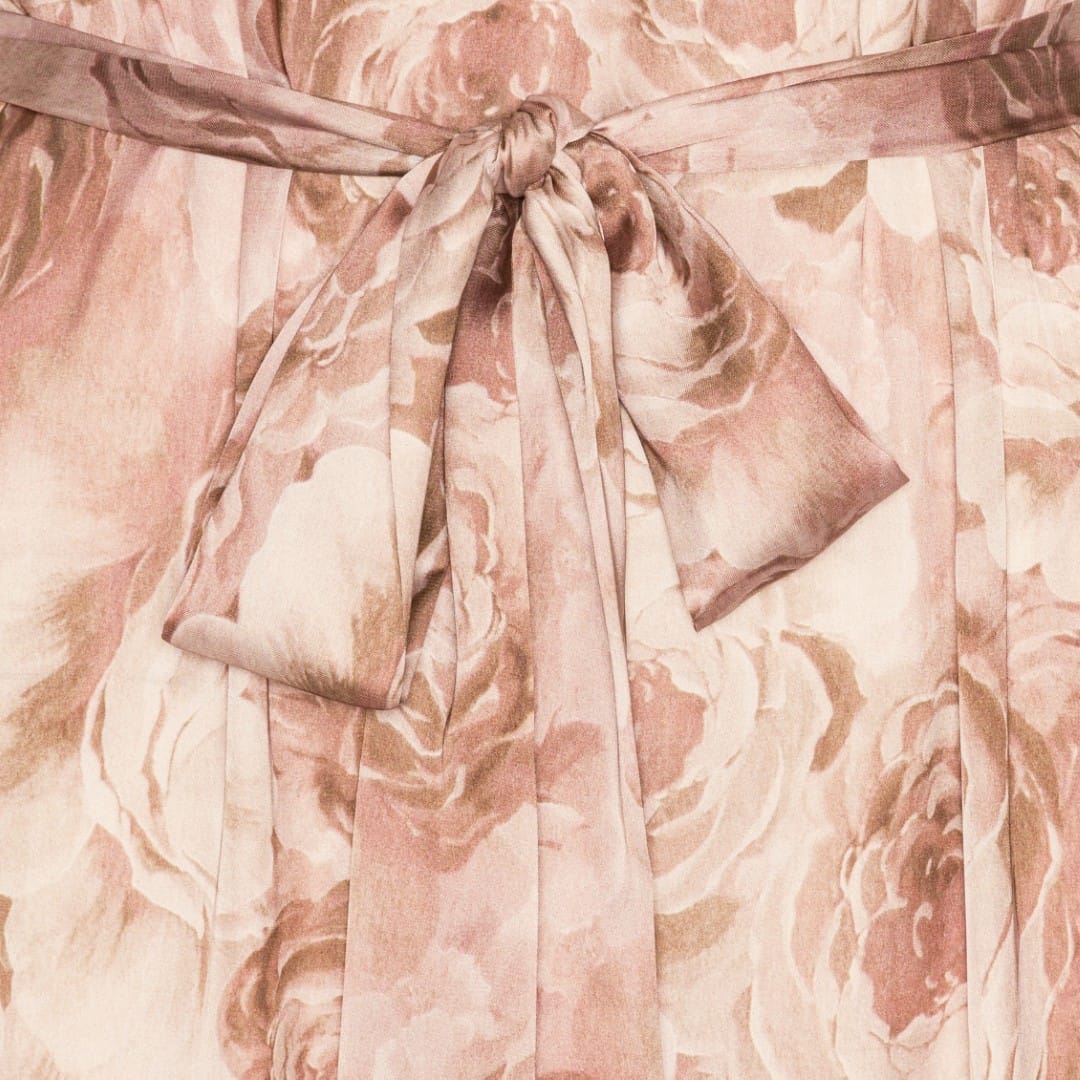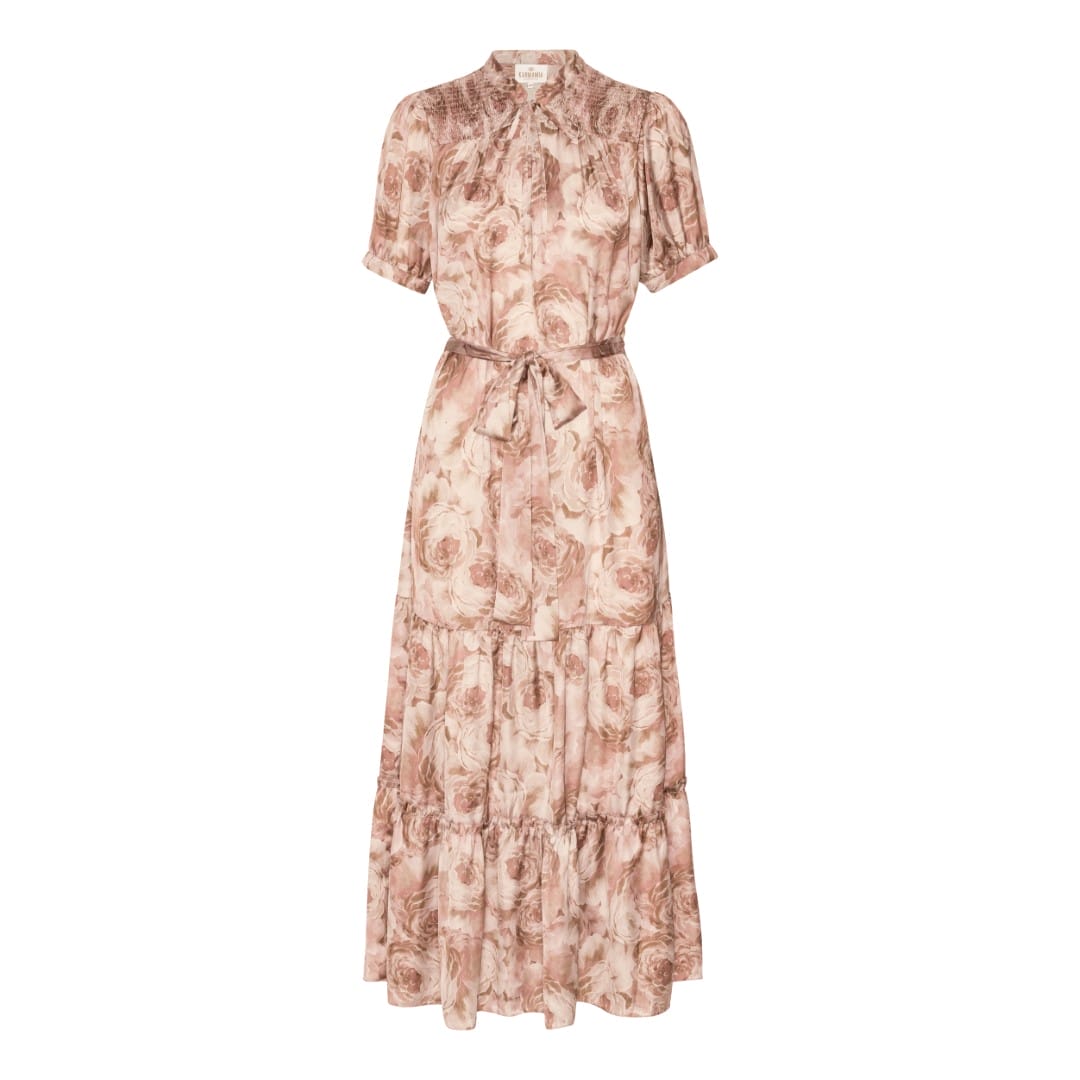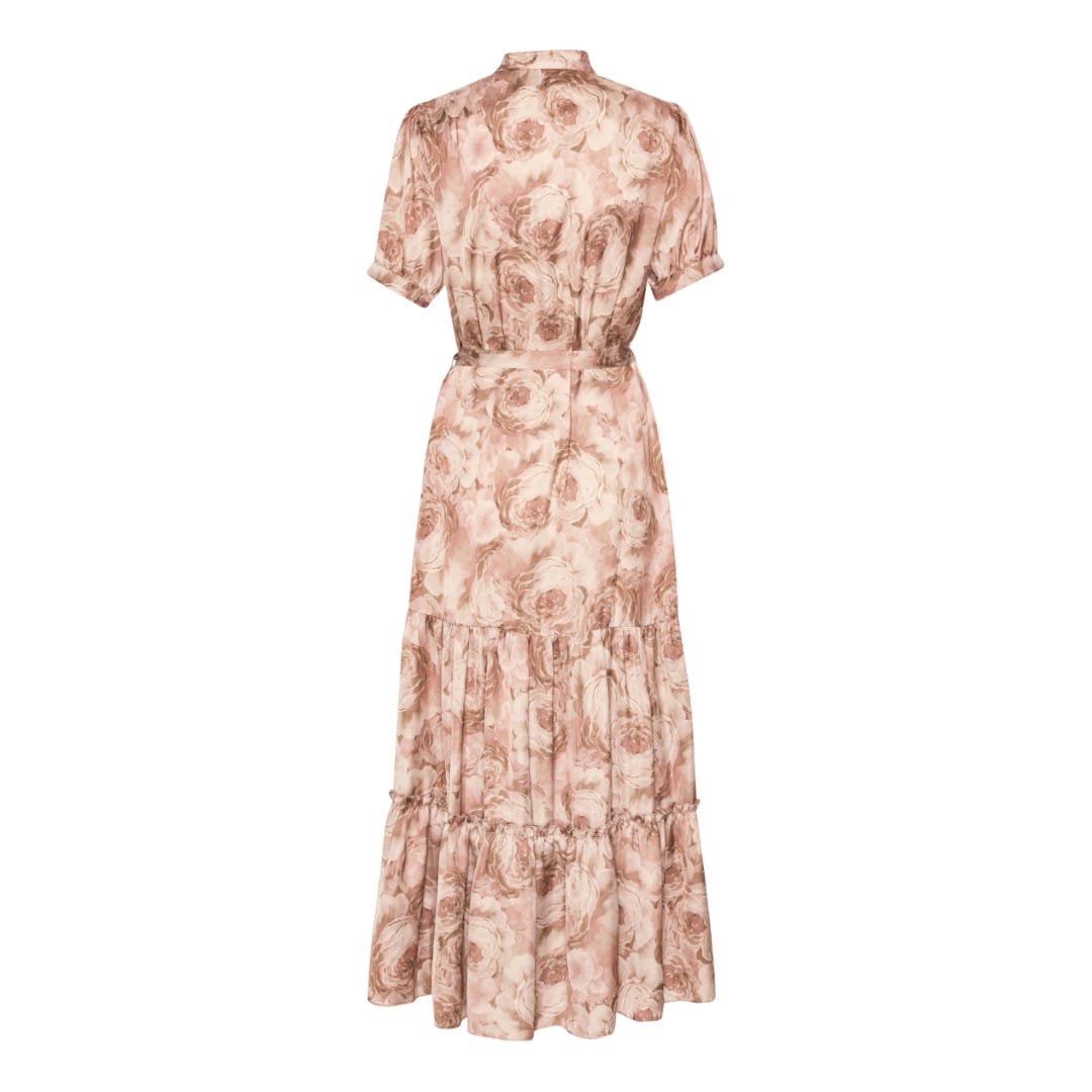 Smuk kjole, der er feminin hele vejen igennem. Kjolen har romantiske detaljer som rynkede skuldre for at fremhæve halsudskæringen og en flæset nederdel der let flyder forbi midt på læggen.