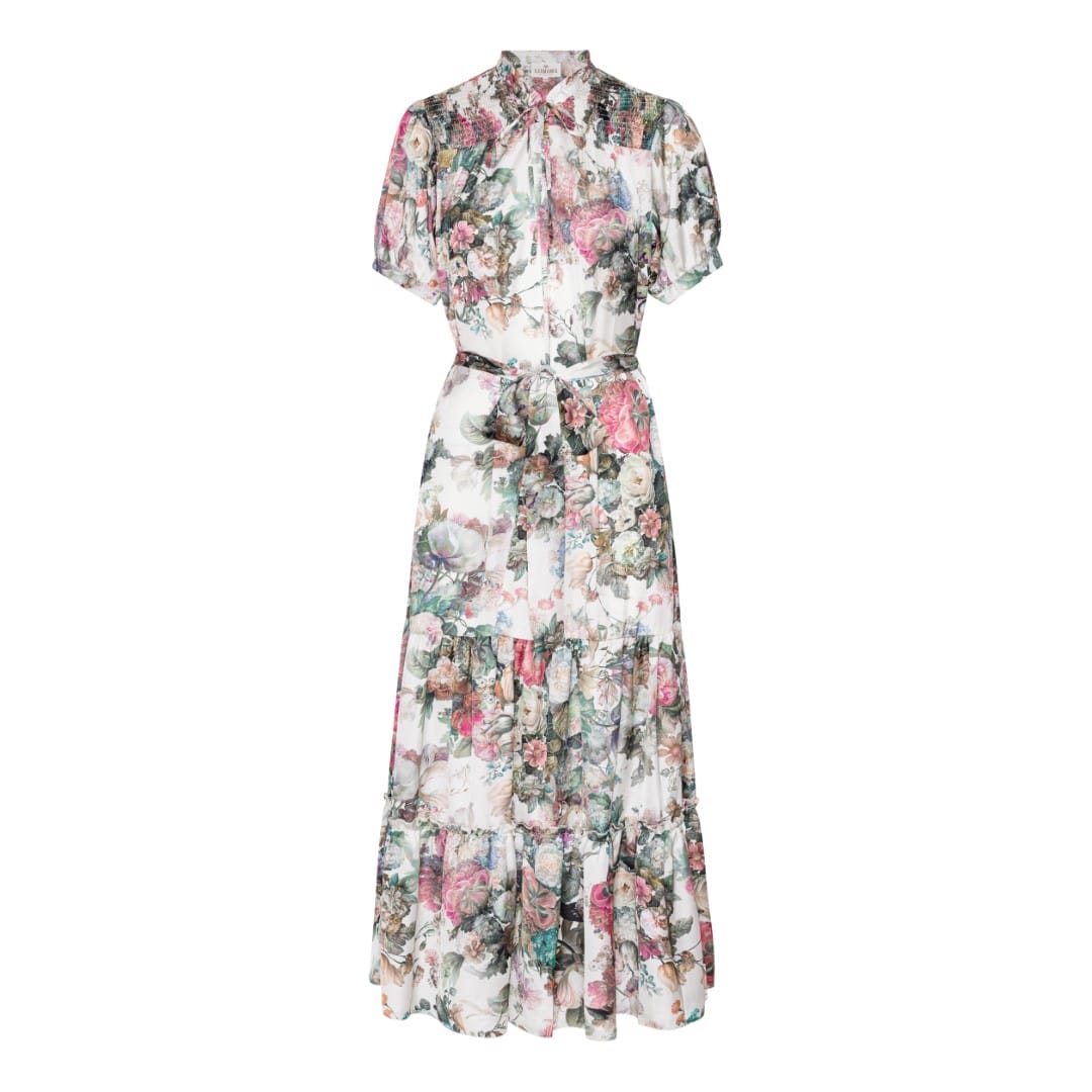 Smuk kjole, der er feminin hele vejen igennem. Kjolen har romantiske detaljer som rynkede skuldre for at fremhæve halsudskæringen og en flæset nederdel der let flyder forbi midt på læggen.