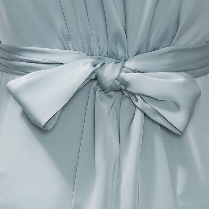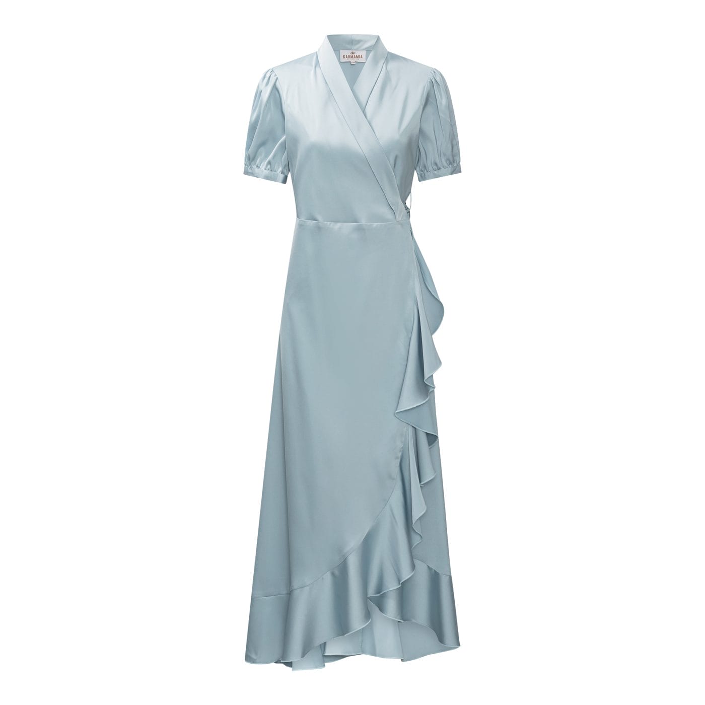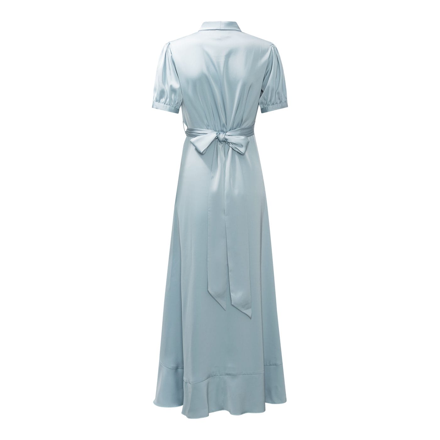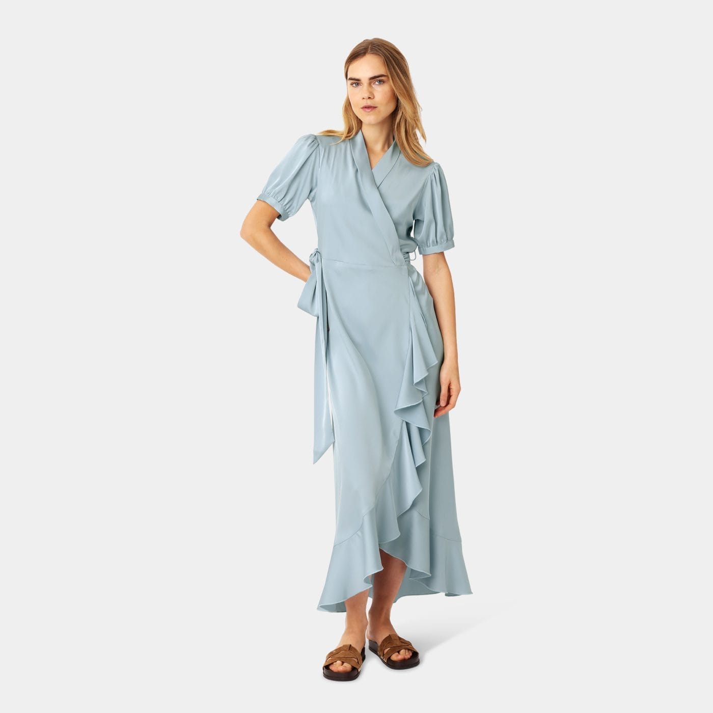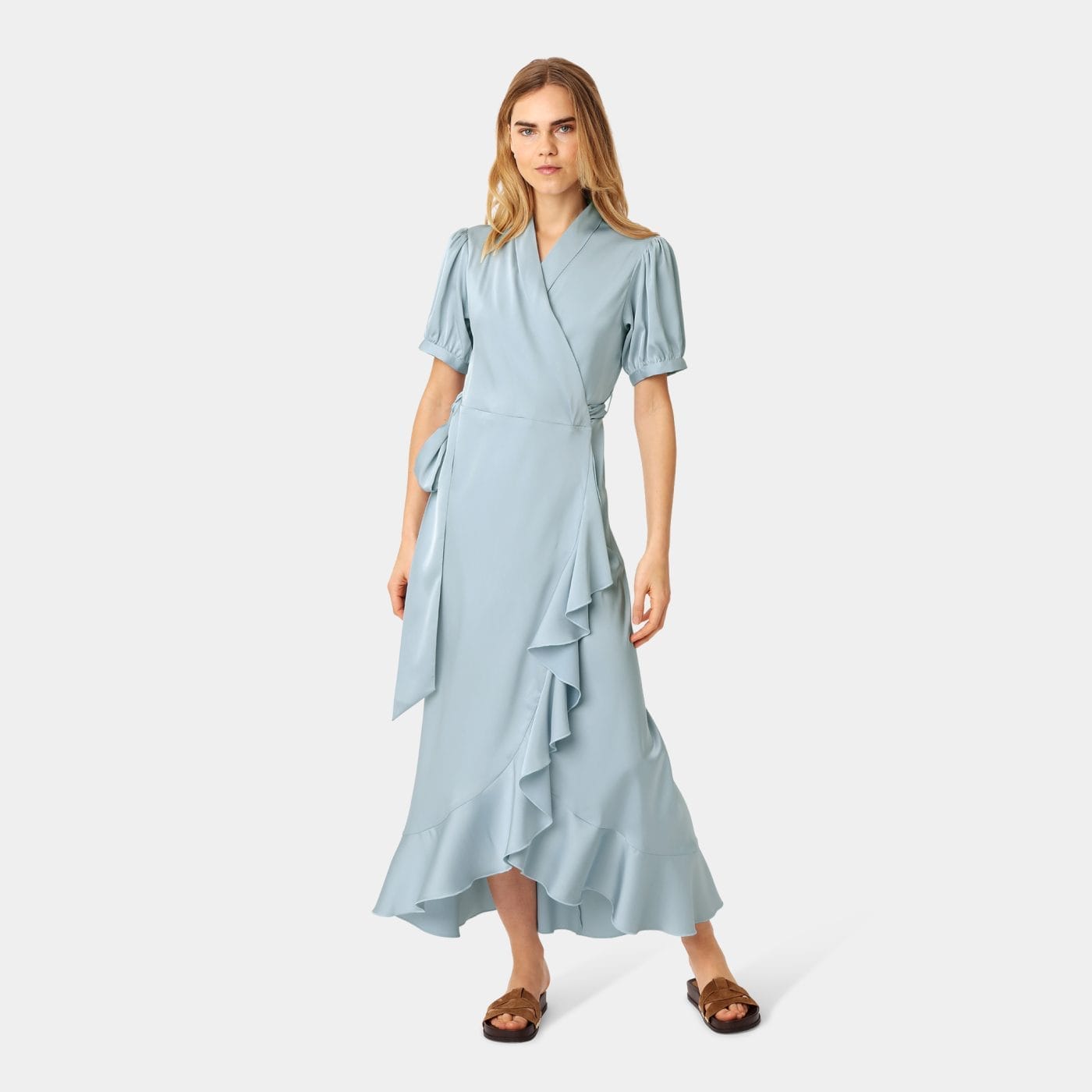 Elegant slå-om-kjole med flæsedetaljer foran og korte ærmer.