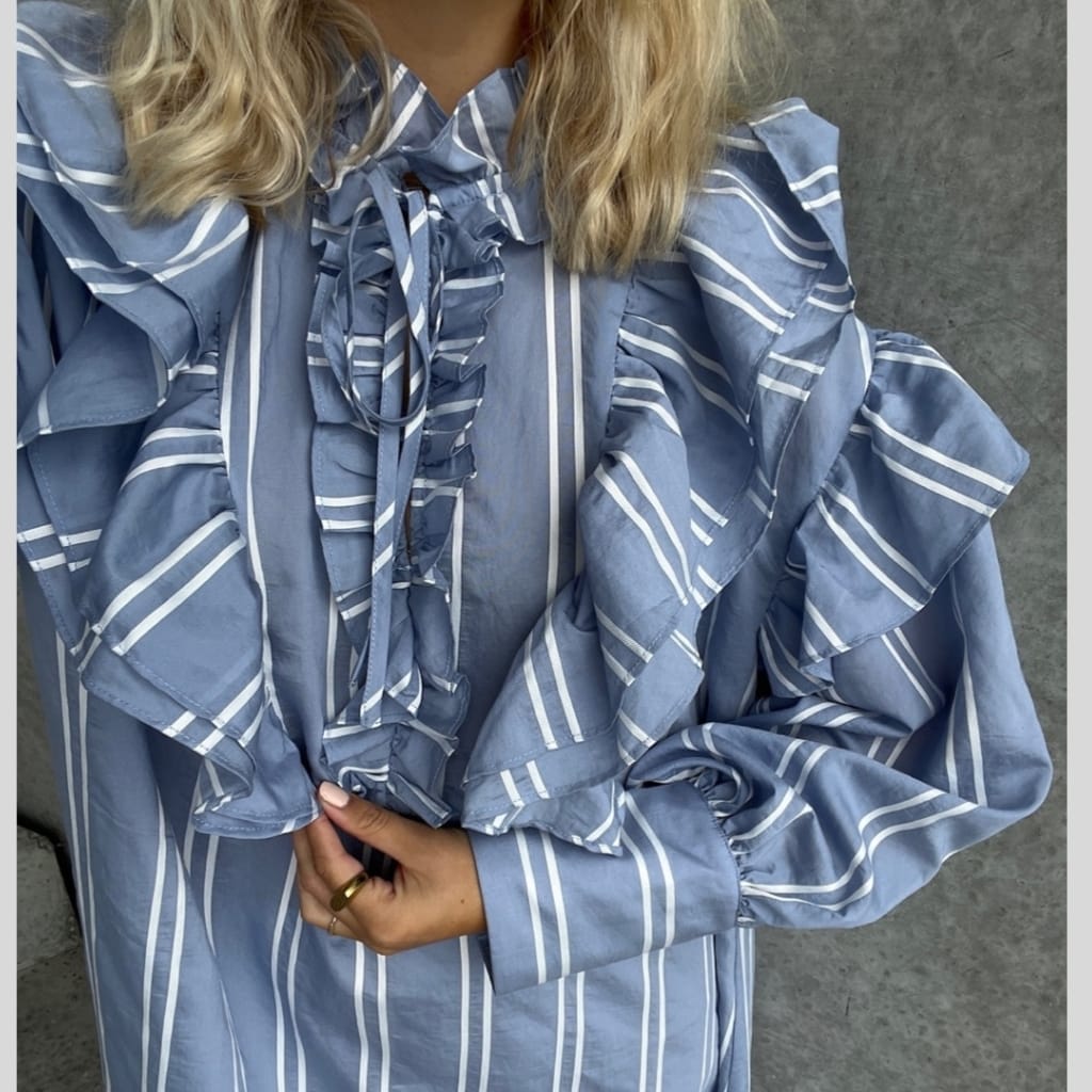 Flæserne, der elegant pryder skuldrene og fortsætter ned langs brystet, skaber et feminint og iøjnefaldende design. Kjolen har en afslappet A-formet pasform, der falder let omkring kroppen, og de lange ærmer afsluttes med manchetter, der understreger det sofistikerede udtryk.