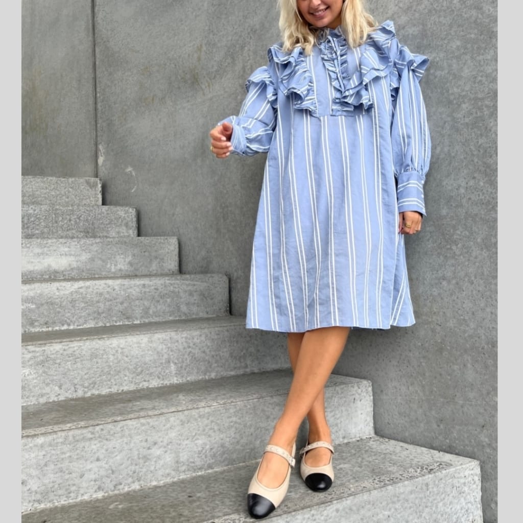 Denne lyseblå kjole med smalle, hvide striber kombinerer klassisk elegance med moderne detaljer.