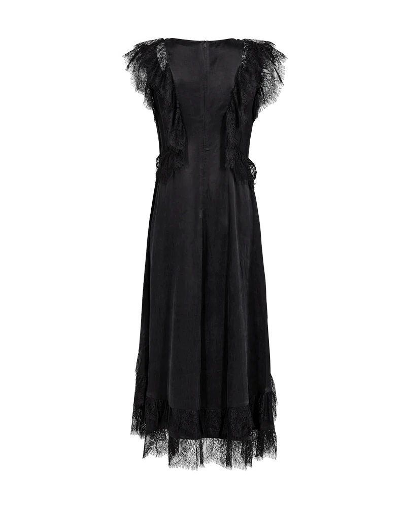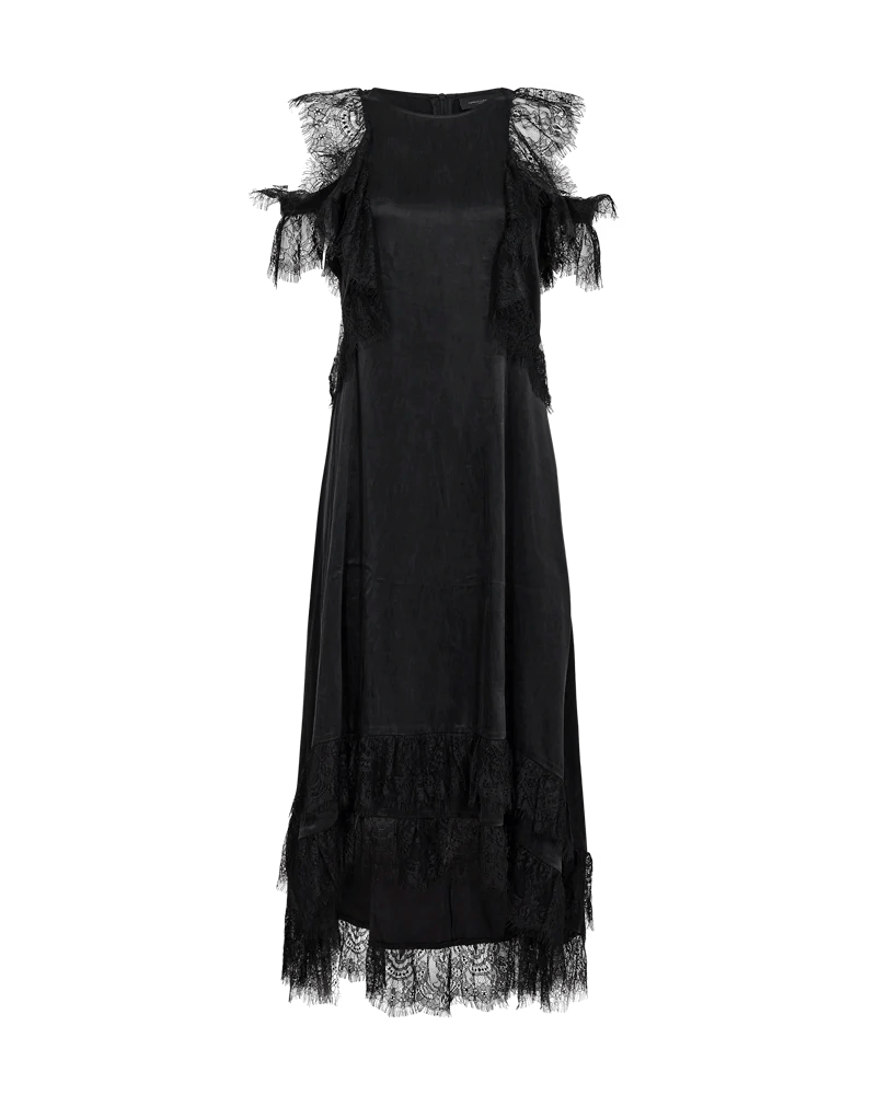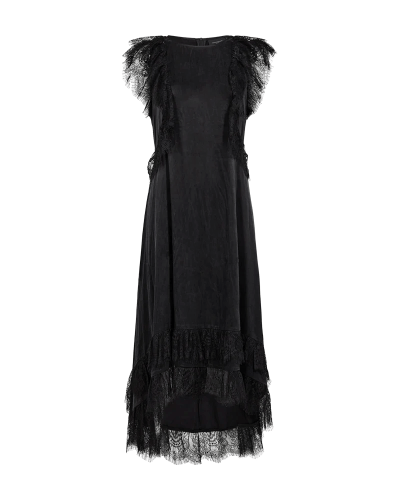 CMMARTA-DRESS er en lang kjole i en eksklusiv cupro-kvalitet med flæser med frynsede tungekanter. Kjolen er kortere foran med skjult lynlåslukning på ryggen, en rund halsudskæring samt et bredt skørt.