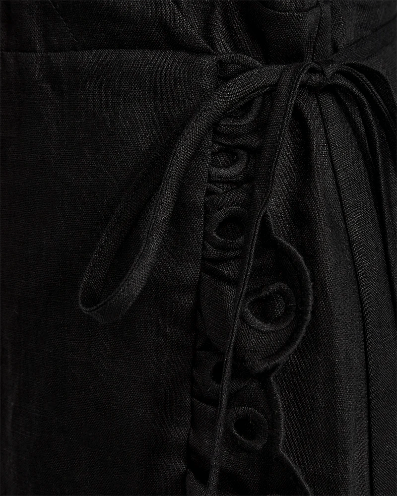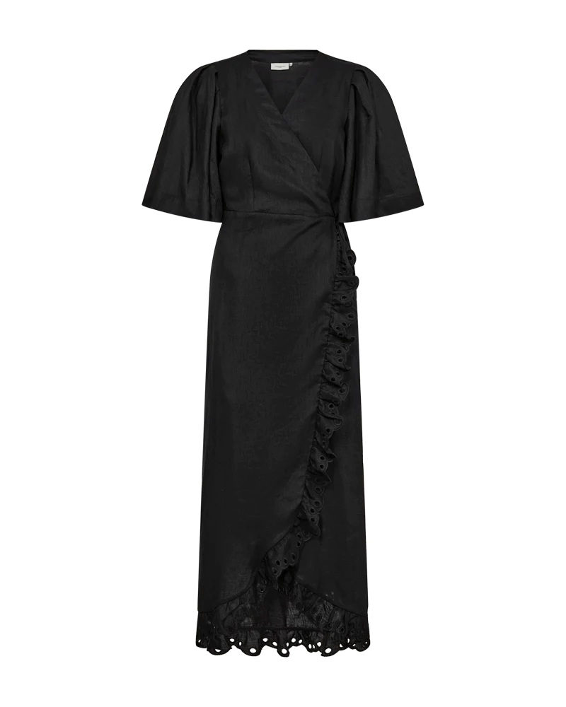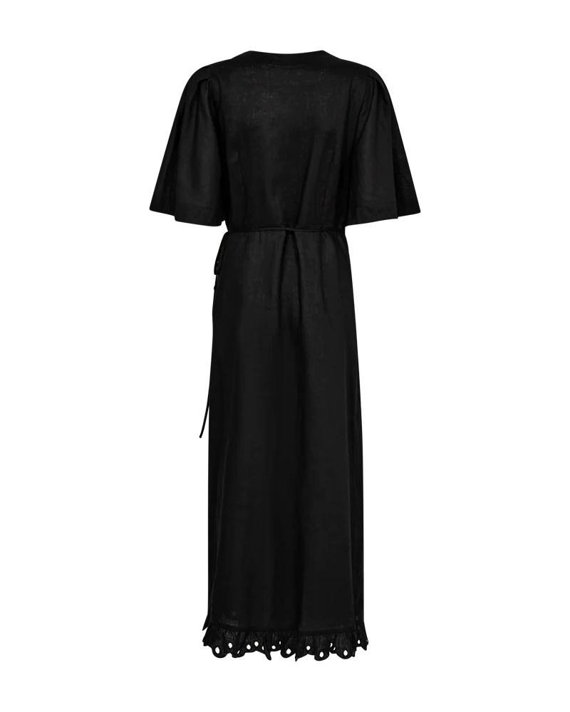 CMNATULI-DRESS er en slå-om-kjole i en let kvalitet med blondedetaljer, bindebånd i taljen, korte pufærmer samt V-udskæring.