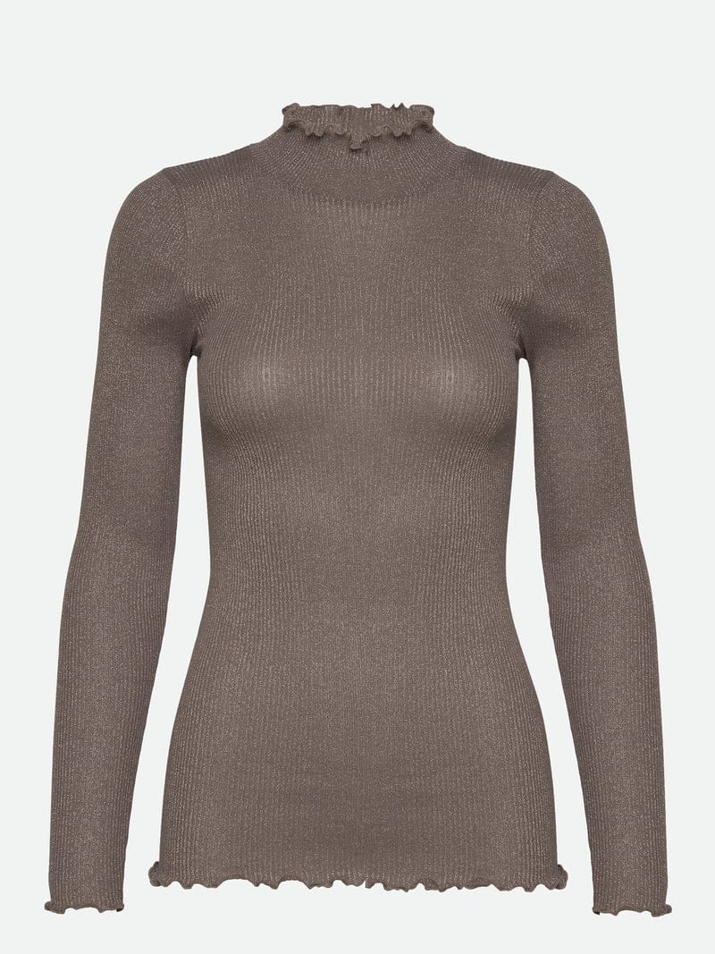 Denne turtleneck bluse udstråler sofistikation med dens krølkant ved halsen og forneden, hvilket tilføjer et strejf af elegance til ethvert outfit. Fremstillet med lyrex/metalliserede fibre, giver den en subtil glans, der udstråler underspillet glamour. Kombinationen af turtleneck designet og de metalliserede fibre løfter denne bluse, hvilket gør den velegnet til både afslappede og finere lejligheder.
