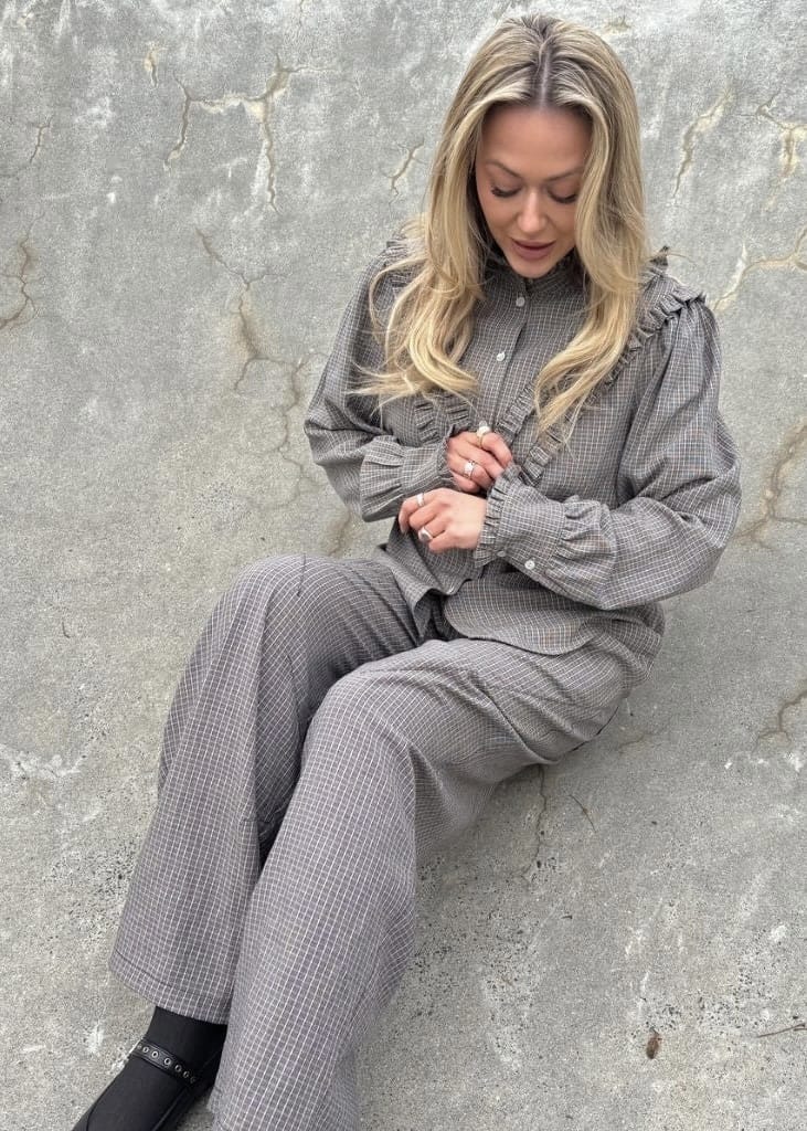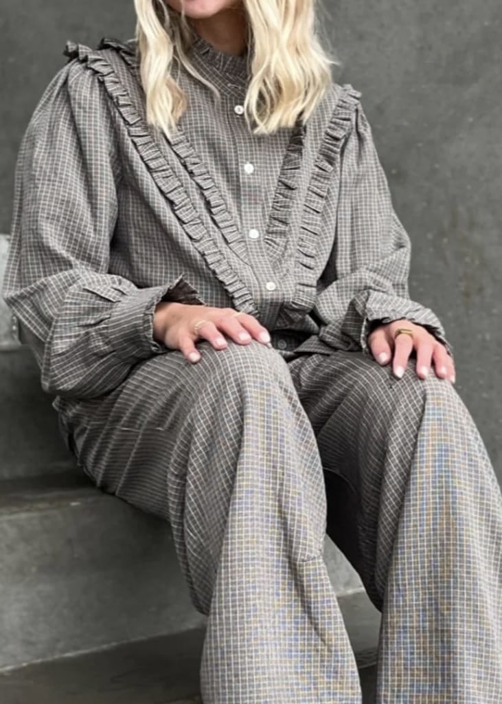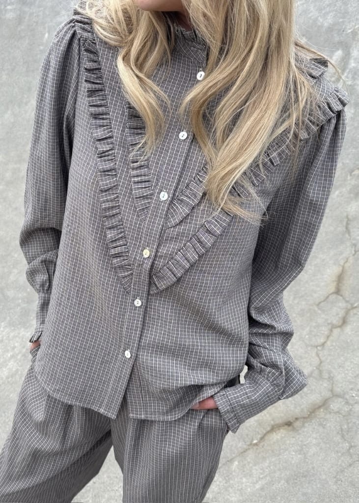 En feminin skjorte med fine detaljer og rummelig pasform. Modellen har et diskret ternet mønster i sort/cream og et dekorativt flæsebånd, der løber i en V-form ned over fronten og skuldrene. De brede manchetter og de bløde folder ved bærestykket tilføjer ekstra charme og gør skjorten nem at style både op og ned. Brug den sammen med matchende bukser for et fuldendt sæt eller alene med jeans og støvler.