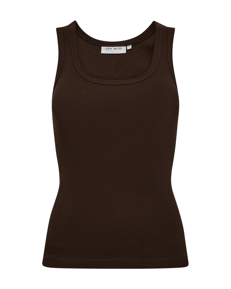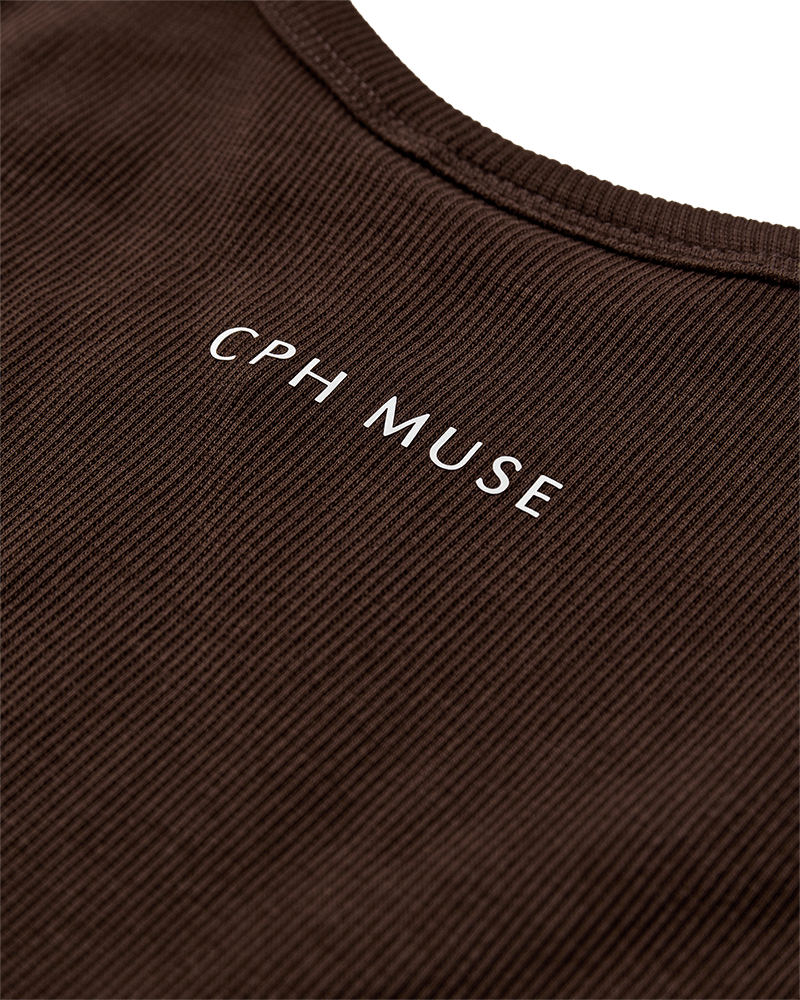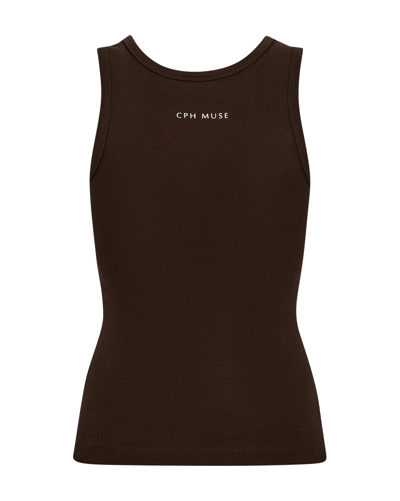 Copenhagen Muse Siv Top er en tætsiddende top i en tyk, ribstrikket kvalitet med meget elasticitet, der holder vask efter vask. Toppen har en rund halsudskæring, brede skulderstropper samt logodetalje på ryggen.