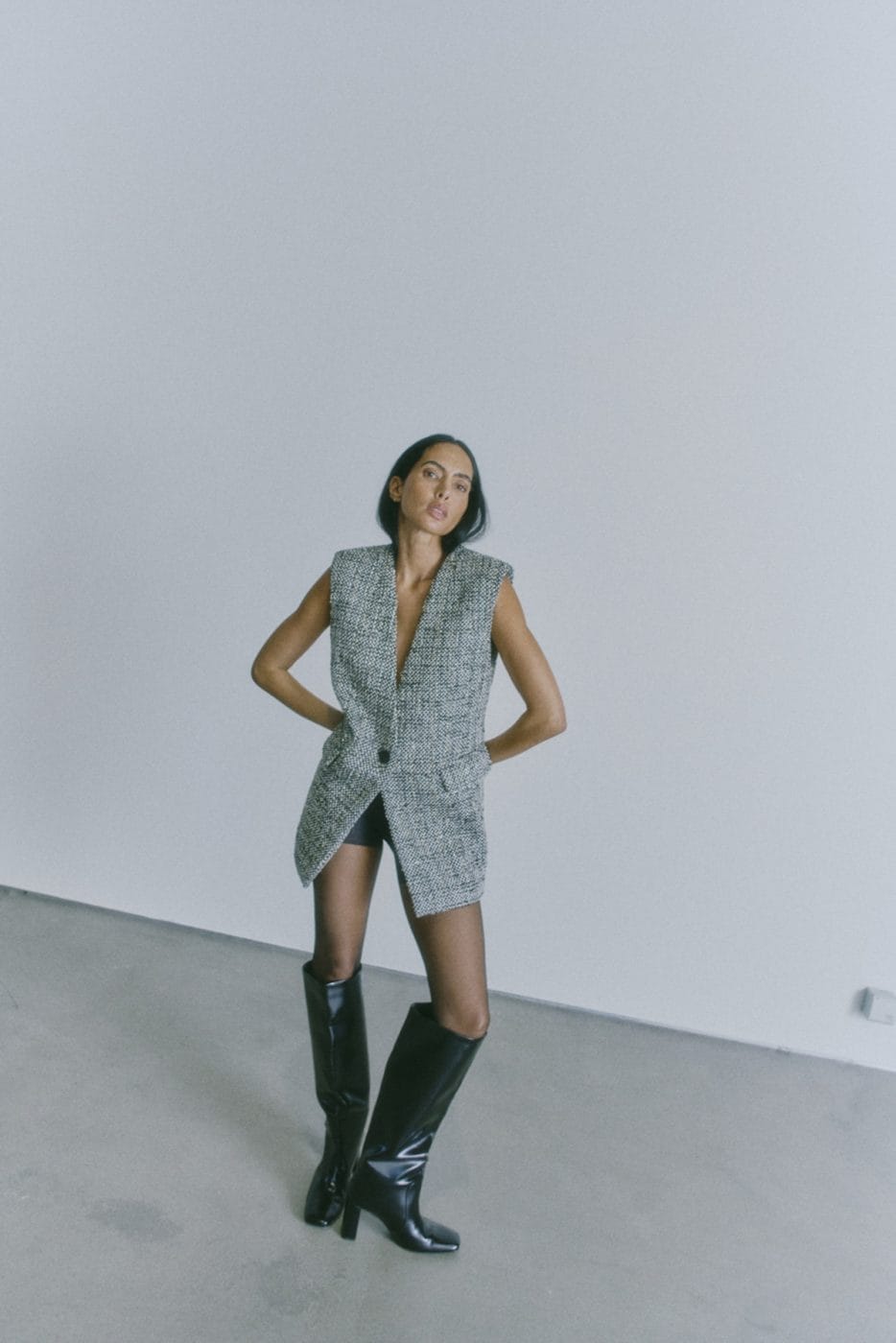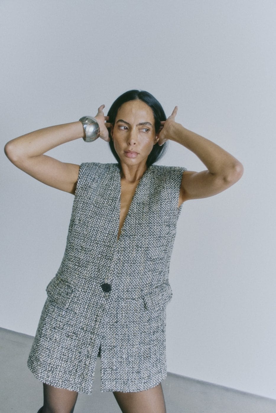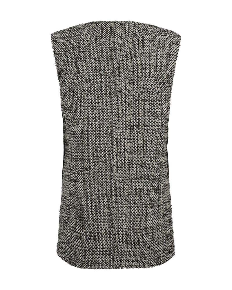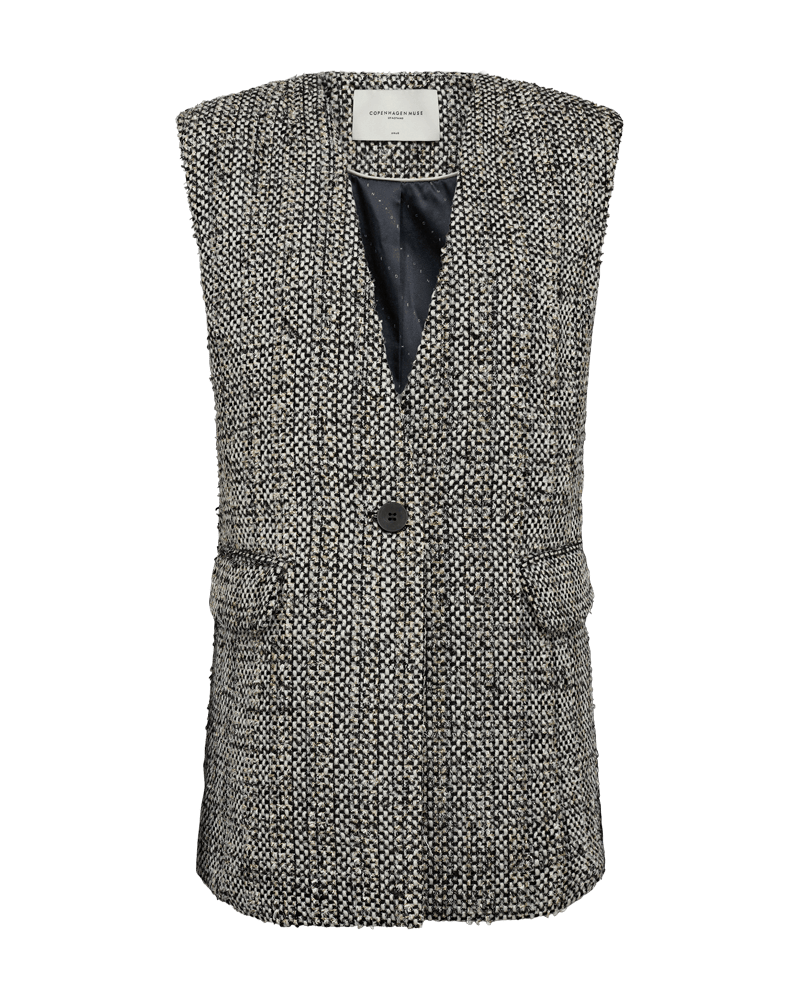 RUBI-WAISTCOAT er en vest i en eksklusiv kvalitet med en stilfuld, chunky strikket struktur bestående af sølv- og guldtråde. Vesten har derudover v-udskæring, brede skuldrer, frontlommer, en slids bagpå samt logomønstret foring.