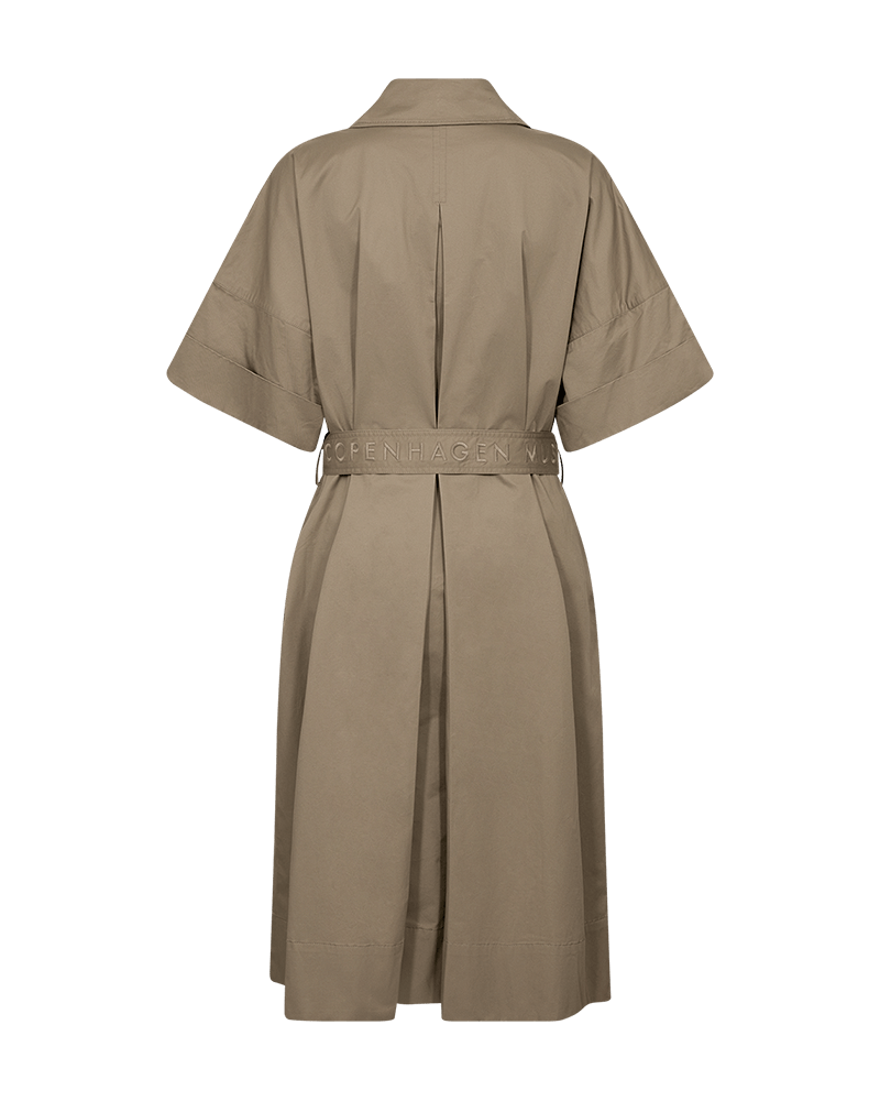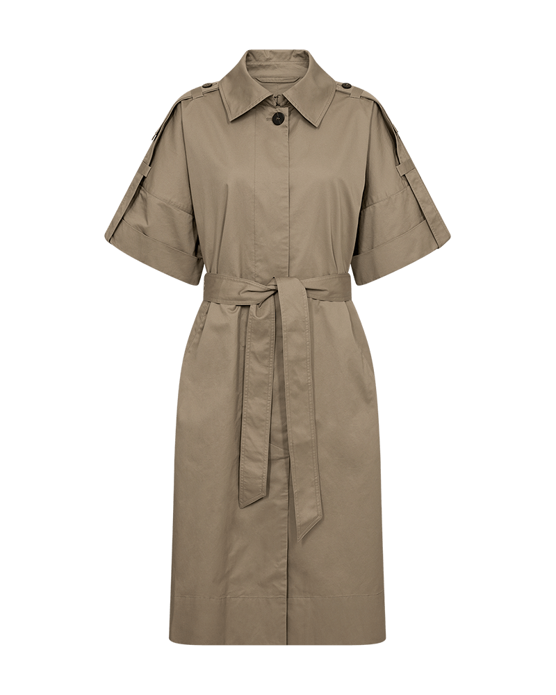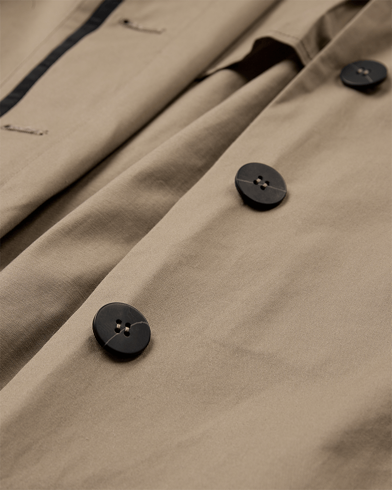 CMFLOT-COAT er en trenchcoat i en vandafvisende kvalitet af 100% bomuld med coating. Frakken har en oversize pasform med bindebånd i taljen, skjult knaplukning på fronten, sidelommer samt korte ærmer med opsmøg.