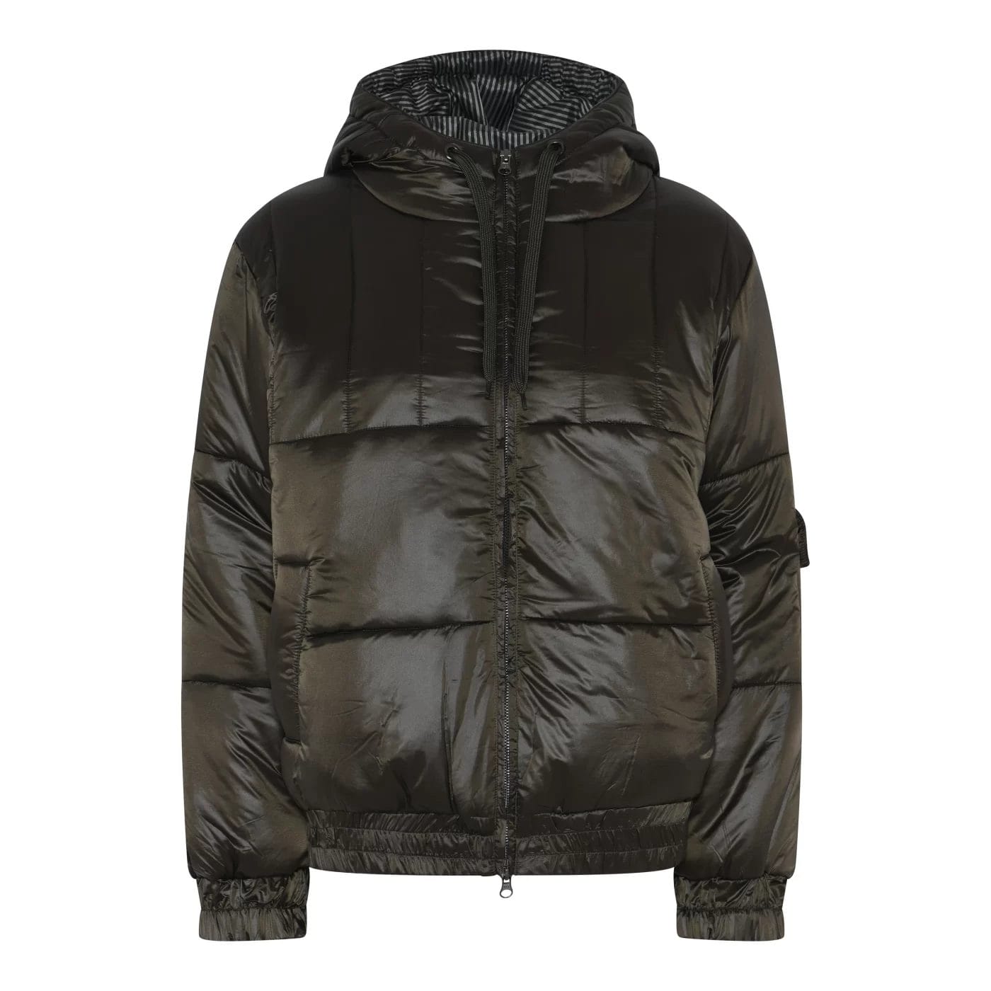 En varm dunjakke med forlommer, lomme-på-ærmet-detalje med refleksprint, en hætte og stribet inderforet.